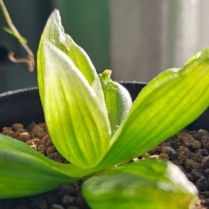 ハオルチアじゃない(・・?) ブルビネ属 メセンブリアントイデス 通称『メセブリ』 京都みどりのマルシェの戦利品😊💕 ハオ?違うの…(・・?) 冬型の多肉植物で、夏は上の葉っぱが枯れ、塊根だけになるようです。夏の間は断水。 触感もハオとは全然違ってぺったりしててぷにぷに! グミを触ったような感じ⤴︎ 今時期は日陰じゃなくてお日様大好きなんだそう☀️ しっかり光当てて先端が徐々に潰れてくると青光り?するとか…その後休眠するそうです 休眠期は風通し良く断水して蒸れないように気をつけるそう 成長期の水やりはしっかり乾いたらたっぷりとが基本😊 冬は今年の寒波も耐えて氷点下でも屋外大丈夫だったよ👍との事 上手く育てられると良いなぁ💕🎶😊⤴︎ 前から欲しかった白ミューもまだ小さな苗だけど連れて帰ってきました😙今後の成長が楽しみです🎶