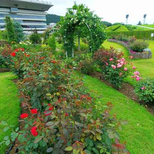 7/14(日)に、夏の競馬が絶賛開催中の、福島競馬場に行って来ました。 とは言っても、自分のお目当ては、初めて訪れるローズガーデンです(笑) 福島市は生憎の梅雨空でしたが、午後の数時間雨が止み、傘なしで馬場内の広場を歩き回ることができました。 福島競馬場ローズガーデン① ターフビジョンの近くだったような気がする~