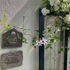 クレマチス マーガレットハントと白いバラのアルバメイディランドが咲きました🌿✨ ここはほぼ一緒に咲く組です✿ 隣りの新雪とアナベルも🌿✨