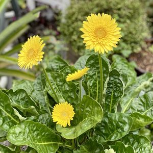 ガーベラ ガルビネア マジェスティック イエロー💛 去年秋に、小さな苗で植えたガーベラ🌼 初めて育てているお花ですෆ.*・゚ この猛暑の中、元気にかわいいお花を咲かせてくれました🌼💕蕾も控えていますෆ⸝⸝꙳ 葉っぱがでこぼこしてるけど、大丈夫かな…🤔💭 pic3枚目は、10月に植え付けた頃🪴 同じ頃に植えたもう1種類のガーベラ、ガルビネア スウィートフィエスタは葉っぱのみ🌿(picなし) がんば〜(*•̀ᴗ•́*)و ̑̑