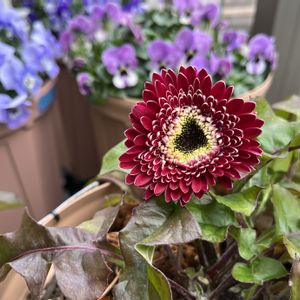 ガーベラ・ガルビネア スイートメモリー 夕方、ほんの一瞬雪がチラつきました❄️ わが家のガーベラは花を咲かせたまま春を迎えそうです😌