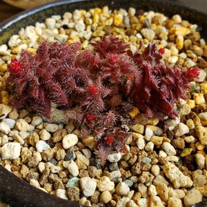 クラッスラ属 🦀トランスバール セツローサ🦀 〜毛蟹星〜 おやっ⁉️ おや、おや、、おや〜〜 株中央に ポツポツっとちょっぴり赤い点が、、、花芽だ❣️ 左下は 昨年12/12UP画像! 密密密だったのでUP後 解体して 数個のポットに植え替えた 玄関に入れっぱなしだった子を 今朝 外に出して 水やりをしていて 花芽 発見╰(*´︶`*)╯♡ いつ咲くかなあ♪(๑ᴖ◡ᴖ๑)♪