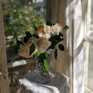 おはようございます🥰💕 今日はよく晴れてます🌞 朝露が凄いです〜😅 お布団干せるかな🙄 寒暖差と朝露などでバラの花びらは痛み勝ちになりました😔 傷んでいるお花取ったら大分寂しくなりそうです🥹 今週植え替えるつもりでお花をカットしたボレロさん😻💓✨ フワッフワ😍🧁 ジュビリーちゃんも申し分なく咲き誇っています🥰 ジュビリーちゃん数年前は瀕死だったけど、鉢を小さくして根気よく見ていたらほそぼそですがよく咲くようになりました💓 三枚目はオマケ🤭 後ろに見えるブルーシートは夜虎美ハウスに被せて防寒している物になります。下の青い小屋は初代虎美ハウス☺️ 骨組みが四本しかないのであっという間に潰されてしまいました😂 そうそう、肝心のお話したいこと忘れて投稿してしまいましたので追加します🥰 隣町に新しくパン屋さんが出来ました😻 開店時間は毎週日月火で11時開店🙄 主人が見つけて、話してくれました🥰 買い物ついでに寄ろうとしても、開店時間と合わなくて…ずっと行けませんでした🥹 昨日やっと行くことができました🍞🥐💕 奥ではご年配の男性がエプロン姿で一生懸命作っています☺️ 私は好物のカレーパンとアンパンを買いました。レジには男性と同じくらいの年齢の女性が立っていました👀 思わず聞きました。 「ご夫婦でなさってるんですか?😳」 「はい〜☺️💕」 定年になって、後は隠居生活と言う人生も良いけど、残された2人時間を一緒に夢を追いかけるのもとっても素敵だと感動しました😻💓
