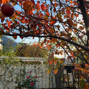 ジューンベリーの紅葉🍁 うまく写せなくて残念ですが、とっても綺麗です♥️ いま咲いている薔薇を摘んで、百均の花瓶に(笑) いい香りです💕