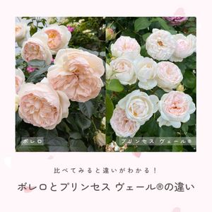 . \ ボレロとプリンセス ヴェール®の違い / - ボレロ - 『ボレロ』はやわらかな花びらが ふんわりと重なって、 とても繊細な印象です。 トロピカルフルーツのような香りに、 かすかなスパイシーさを含む複雑な香りです。 花は繊細なのに、 病気にも強いというギャップがあります。 株も暴れることなく、 ふんわりときれいにまとまります。 . ・*:..。o○゚・*:..。o○゚・*:..。o○゚ 【ボレロ】 系統:四季咲き中輪系 花色:純白~中心ごく淡いピンク 花径:10cm 樹高:0.8m ロゼット咲き/半横張り性 ・*:..。o○゚・*:..。o○゚・*:..。o○゚ . . . - プリンセス ヴェール® - 『プリンセス ヴェール®』は 花はロマンティックな雰囲気で、 爽やかなフルーティさに、 甘いフローラルな香りも楽しめます。 とても病気に強く健康的なイメージで、 ボレロよりも背は高くなります。 元気な枝が出ますので、 『ちょっとおてんばなプリンセス』という印象ですね♪ . ・*:..。o○゚・*:..。o○゚・*:..。o○゚ 【プリンセス ヴェール®】 系統:四季咲き中輪系 花色:クリームピンク 花径:8cm 樹高:1.2m ロゼット咲き/半直立性 ・*:..。o○゚・*:..。o○゚・*:..。o○゚