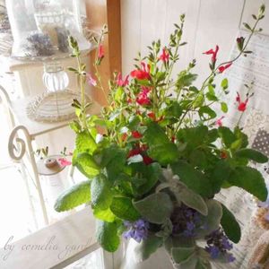 伸びすぎてしまったチェリーセージをカットして、他のハーブ🌿もプラスして飾ったらとってもいい香り♪゚゚+.・.。*゚♪゚゚+.・.。*゚♪゚゚+.・.。*゚♪