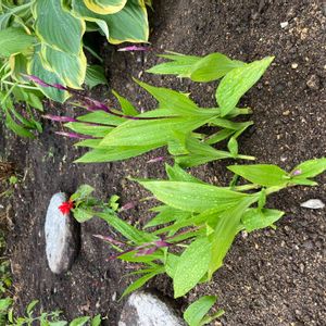お庭の植物の名前を知りたいです。(写真中央の植物) よろしくお願い致します。