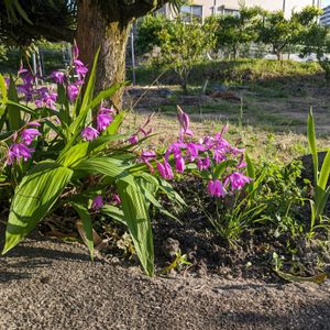 ご近所の畑でシランが咲いていました💕 我が家のシランは日陰で まだ小さなツボミが付いたところです😊 早く咲かないかなぁー
