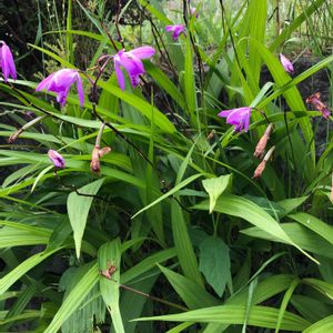 我が家の庭や花畑の紫蘭(シラン) あちこち、たくさん咲いてきました‼️ 静岡県の地域によっては 昨日32度まで、上がり、夏のようなのに 避暑地の富士山麓は、 まだまだ春の終わりかなぁ?⁉️ 立派なランと同じ花ですね🌸