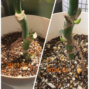 5/4に剪定したモンステラの1番下の部分です。 茎と根だけにした部分ですが、 大きな葉が二枚出てくれました。 次に出る葉には、切れ目があるといいな😊