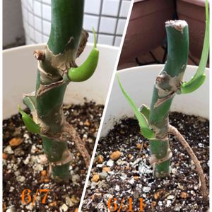 5/4に剪定したモンステラから、新芽が二つ! ひとつはかなり大きな葉が期待出来そうです😆