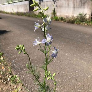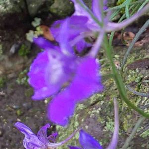 5/22㈮⑤ 🏷雫2020 青い花と雫のコラボです。 💜チドリソウと雫 昨日の朝、マンションの庭の共用スペースに大好きなチドリソウが咲いているのを発見😲‼️😲エェーッ‼️ いや〜うちのマンションの花好きさんたちと好みが合うので、嬉しい驚きです😃💜💜 この2本以外にツボミが付いてるのが4本ありました😄🎶何色が咲くのか楽しみです🍀