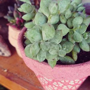 情けないくらい土が見えるけど、見なかった事に(o・ω-人) 確か、ブルーサプライズだったと…😅 最近よく出てくる万宝に、ムチムチには、ちと欠けるおっぱい系多肉は誰かな? 鉢はikuraさんの。 もう、一昨年になる?東京ロハスで手に入れました。 なのに、こんなスカスカで申し訳ない(>人<)
