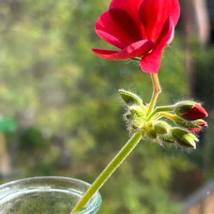 お花の終わった茎を✂️切ろうと思っていたのに、 蕾の茎を✂️チョンパしてしまった💦 「あーっ‼️(((;꒪ꈊ꒪;)))…… ごめ〜〜〜〜〜〜ん!(>人<;)」 「えーーーーっ?(● ˃̶͈̀ロ˂̶͈́)੭ꠥ⁾⁾ ここで咲かせてもらえないんですかぁ⁉︎」 しかし、寛大な彼女・:*+.\(( °ω° ))/.:+ 突然の引越しにも動揺せず、 小さなビンに住まいを移しても、 ご機嫌よく咲かせてくれた✨✨