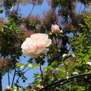 スモークツリーの前で咲き出した“ジェネラスガーデナー” とっても優しい色です🎶 フェンスの上で咲いているので、側に行かないと見えなくなりました😆