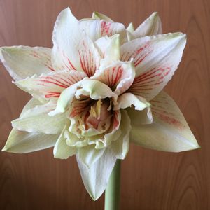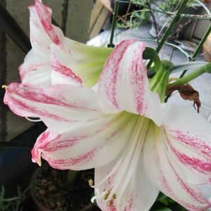 アマリリス、知人が交配して、今年咲いた🌼 白色に少し赤の交配かな