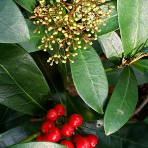 ミヤマシキミ (別名 億両) 花 2~3月 実 11月 1️⃣毒性(アルカロイド)なので鹿も食べない。 花の時期に昨年の実がしっかり残っている。 2️⃣24/11📱 3️⃣たまに赤のツボミも見かける