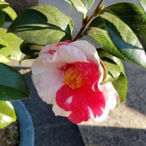 今朝のツバキ(岩根絞)❤️🤍❤️ ようやく太陽が✨🌞✨気持ちいい〜♫