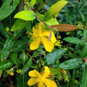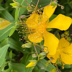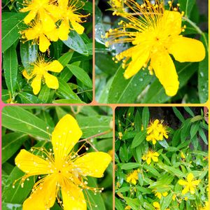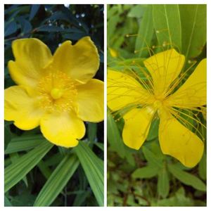 左👈大輪金糸梅 (ヒベリカムヒドコート) 雄しべを金の糸に、5弁の花を梅に見立て つけられた名前です。 右👉ビョウヤナギ(未央柳) 中国の楊貴妃の宮殿、未央宮に因んで。葉は、柳に似ていることからとのこと。 5/31撮影 @ご近所