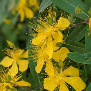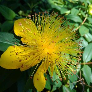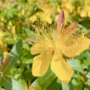 昨日のキンシバイ問題で推測中に出会った セイヨウキンシバイさんか? と思ったけれど シベの先が全部黄色 という特徴的に ビヨウヤナギ氏? ◇以下推測の為の検索による引用メモ ビヨウヤナギ Hypericum chinense 和名:ビヨウヤナギ(美容柳) その他の名前:ヒペリカム 科名:オトギリソウ科 属名:オトギリソウ属 ビョウヤナギは中国原産の半落葉性の低木。古くから庭園花木として植栽されていたが、近年は路側帯などに植栽されているのを見ることが多くなった。株立ちになり、樹高は1mを越えるが、枝先は垂れ下がる。葉は対生して細長く、長さ8cmほどになる。6月から7月にかけ、直径5cmほどの大きな黄金色の花を開く。雄しべの花糸は多数に分かれ、光り輝いて美しい。葉柄はなく、対生している点などはヤナギとはずいぶんイメージが異なるが、和名は漢名の「未央柳」である。花の形だけからいえば、こちらの方が「金糸梅」と名前が付いてもおかしくない。 ◇違いも検索引用メモ◇ ◇ビョウヤナギとセイヨウキンシバイの違い◇ 両者の違いはオシベの先の葯の色です。 ビヨウヤナギは黄色〜白。 セイヨウキンシバイは赤橙色。 また、オシベの伸び方もビヨウヤナギがカールして上を向くのに対し、セイヨウキンシバイは直線的に伸びます。 ◇補足 ここでタグを増やしたく無いので GS内検索 『赤い茎が素敵なキンシバイ』 でその投稿に辿り着けるでしょうか。 ⬇️ 他の方のご投稿が混じるようになったので このシリーズは 🏷 you-_-you+ ヒペ🏷