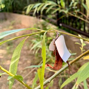 今朝も、サネカヅラについたちびミノムシたちを退治 : 5回目。15匹。 これで、合計213匹!! 大きいものは脱け殻。 サネカヅラのつる、ぐんぐん延びてます。成長期なのですね⁉️ 今日は、朝から日差しが強く、背中が熱々でしたぁ🥵➰・←ミノムシ