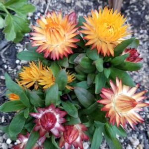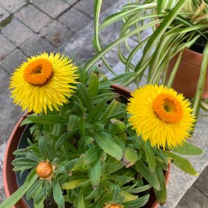 こんにちわ😃 きのう見つけたお花❇️❇️❇️ 「ムギワラギク」かな⁉️ どなたか教えてください😃 ヘリクリサム 別名ムギワラギク「帝王貝細工」と教えていただきました😃