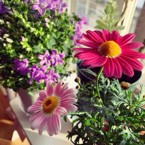 だんだんどん春めいてきましたね。 マーガレットストロベリーホイップという品種です。ホームセンターで298円! カンパニュラと並べると、彩りがいいですね。部屋が明るくなります。