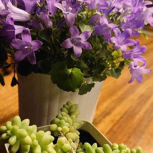 連投失礼します🙇♀️ 💠今日のお花💠 💜オトメギキョウ💜 まだ咲いていました 上が植え替え時に株分した小さな鉢 下が元株です 先程撮影しました カンパニュラ オーシャン 別名 ベルフラワー 3月にお迎えしてから繰り返し咲いています 今はチョッピリ咲いています 今まで「オトメギキョウ」とは知りませんでした