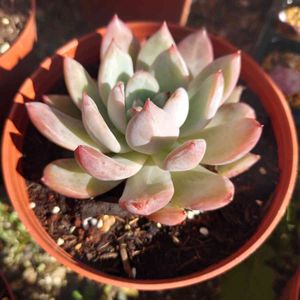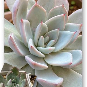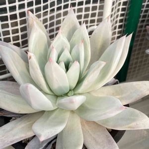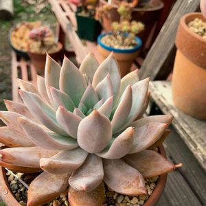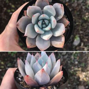 おばあちゃんちにあった鉢に植え付けたシクラメンとアリッサムを背景にお粉が素敵な貴族たち😅 (初心者の私にとって1000円以上する苗はもはや貴族) ラウイは地元のお花屋さんでお迎え♡なんと、なんと🥰お花屋さんで私が多肉に興味をあることを話したら、1ケース入荷してくれたの🥺🥺もしも私が気にいるのがなかったり、他に需要がなかったりしたら申し訳ないのでわざわざ入荷していただかなくても良いですって言ったんだけど、お一人でも需要があるならば花屋はそれにお応えしたい所存です。と‼️田舎あるあるかな?でも、絶対この地域に需要は少ない〜😭😭その後、入荷したケースの中でラウイちゃんにはもともと興味があったからお迎えしました🤩🤩 メキシカンジャイアントはね。。。 値段を読み間違えて、レジでやっぱりやめますって恥ずかしくて言えなくてお迎えしたこ🤣🤣まだエケベリアの名前なんて、数個しか知らなかった頃だったから聞いたこともない名前だったけど、見た目で選んだの😅 むちむちボディがたまらん😍❤️それにけっこう大きいの‼️ でも、私の手も大きめだから、あんまり大きく見えないかな💦ピアノ🎹はあんまりできないけど、ドから1オクターブ上のミまでは届くのよ🖐🖐