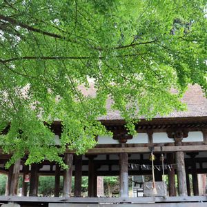 長床の大イチョウ🌱 44本の太い柱に芧葺寄棟造り、周りには壁も扉もない吹き抜けの壮大な建物「長床」は、平安末期に建立された寝殿造の建物。 そこに樹齢800年のご神木・大イチョウが四季折々に「長床」を彩る光景が見られます💓 もう少しするとこのイチョウの葉が、まるで黄色いじゅうたんのように長床を美しく彩り、風が吹くと黄金色の絨毯が見られるそうです✨✴✨ 実はこの長床には「七不思議」の言い伝えがあるそうで、そのひとつに、熊🐻が来て神前に詣でるというものも・・。何故か信じたくなりました😌