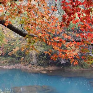 エメラルドブルーの水流と紅葉した木々🍁が美しい🌿💓 苔🌱とどんぐり🙆やキッコウハグマ💠もここで出逢いました💕 ここではダンゴ🍡も空を飛んでくるらしい🛩