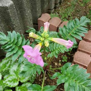 Palさんで購入したインカビレア(インカルビレア?) 『植え付けてから1か月経つけど、全然芽が出ないのよ~💢』と配送のお兄ちゃんに散々愚痴をこぼしましたが(笑) 芽🌱が出た💕と思ったら、あれよあれよという間に成長してお花まで見せてくれています😊 現在、花はティアレラさんのみの北側シェードにちょっと存在感強めの葉っぱとお花🎵咲いてくれて良かったです(笑)
