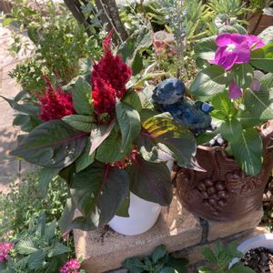💐咲いてる数少ない花💐 セロシア 日々草 寄植えの折鶴ラン🌿樹勢強すぎてサンパラソル🏖️咲きません😂 🌿緑が綺麗、金の成る木🌲 今年はちょっと手抜き🐴🐮🤭 朝から元気がイイ蝉の大合唱🪰🎶🎶 バッタ🦗もピョンピョン飛び回る😅