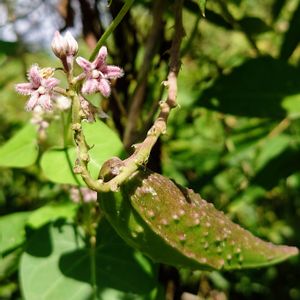 🏷秋の実🍁🍂 可愛い紅紫色のガガイモの花に大きな実が出来ていました、実が弾けてキラキラした綿毛が飛び出すのを見たいです🟢💜🌿 キョウチクトウ科 ガガイモ属