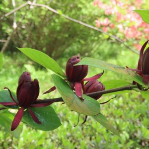 羽団扇楓(ハウチカエデ) ムクロジ科カエデ属 落葉高木 カエデの仲間の中でも掌状の葉が特に大きい 若葉と同時に散房花序を出して下垂し、暗紅紫色の花をつける 花は1つの花序に10 - 15個つき、雄花と両性花が混生する 見事な花を付けてました