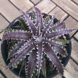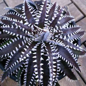 黒い葉と真っ白で大きい刺の対比がすごくキレイに育ちました😁 黒いツヤツヤの葉っぱは葉焼けが怖かったけど、夏場は10時間程直射が当たる場所で雨晒し管理してました🤭 前回ポストしたときは特に気になってませんでしたが、今ではお気に入りの一つになりました🎶 Dyckia tracking code ABB × 'Mary Ellen'