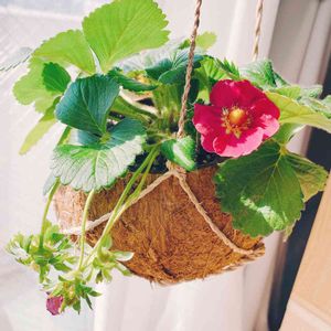 ココナツの吊り鉢に植えたいちごちゃん😍かわいい〜❣ 自然のモノなので形もバラバラ、だけど、妙にフィットしてる気がします💕 確か四季なりいちご🤔だったはず…