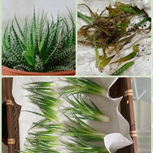昨晩なのですが、🥺大変なことに。 ハオルチオイデスが根腐れに。 ↖️が元気だった時、 ↗️がジュレって取り除いた部分、 ⬇️が溶けたところを取り除いた今。。 古い所のおヒゲがちょい茶色になってて、すごく若いグリーンが飛び出て来てて形がアンバランスになってるな、と思ってました。。。 今思い返しての印象としては、ずっと我慢してたのかな。本当に申し訳ない😣 前日の水やりでガクッとダメになった感じでした。 黒いジュレったところを取り除いたところを乾かしてますが、若い子供のところだけで、かわいそう😢 細いので今日早くも乾いて来ています。 1週間から10日乾かすと書かれてたりしますが、肉厚ではないのでどうでしょう。 バラバラの葉っぱだけのんは、植えてもダメかしら。。。心配です💧