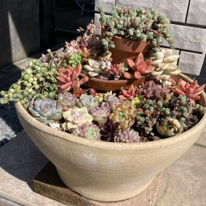 多肉の寄せ植えチャレンジ 大きめの素焼きの鉢に沢山植えました!