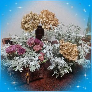 こんばんは〜🌠 今日も一日お疲れ様でした〜<(_ _)> 先日upした白妙菊🤍 カットしてから9日目😊 テーブルに置いてたのでちょっと平べったい感じに😅💦 上手く行きませんが秋に咲いたバラや紫陽花のドライフラワーと一緒にパシャリ⸜(๑ᐢ ᵕ ᐢ๑)⸝ バラの方は篭の中に牡蠣の殻入れて隙間に 紫陽花の方は乾いてるオアシスに 後ろの紫陽花左は2年前のドライ去年漂白したら白くなりました(((o(*゚▽゚*)o)))🤍🤍🤍 又去年の紫陽花も漂白したいですね〜 今年は咲かないかも〜😅💦 なので………… 🏷とにかくGS楽しもう! ですね〜自己満足で楽しみます〜⸂⸂⸜(*^ᵕ^*)⸝⸃⸃ヾ(⁎˃ᴗ˂⁎)☆゚.+:。•*¨*•.¸¸☆* ゚.+:。•*¨*•.¸¸☆*・゚