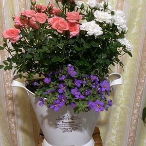 ミニバラの寄せ植え🌹 足元が寂しかったので 見切品のバコパを入れてみました。 もう一個買えば良かったな… もう少ししたらモリモリするかな? チューリップ咲きゼラニウムは 今年はこの一輪だけ咲いた🌷 ちと寂しいな…。