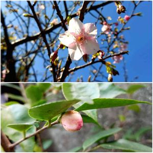 久しぶり晴れ間が出て、暖かい日でした。 散歩道、見かけた早咲の桜🌸。 鉢植にしている極小輪、一重咲き、極淡桃色、つばき。 つぼみが、膨らんできたので、よく見る場所に栄転しました😊