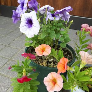 カーポートの下に避難組。 そして再びポンポン咲くペチュニア八重咲きラベンダー。 またかよ…って感じですが、気付いたら満開になってまして…💦こいつぁ撮らねば!と雨の中撮影しました😳 何度もすみません💦 後ろは3回目の満開に向けて頑張ってるミリオンベル グランオレンジ🧡とお買い得なお値段&お花の色に一目惚れして購入したすぐ楽サフィニア みるく&さくら🌸です。 すぐ楽サフィニアはさくら色だけどんどん咲いて、みるく色は遅いです💦 両方満開の道のりは長そう…😨ガンバレー