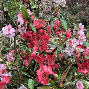 雨滴る春の木瓜 だいぶ見事に咲き乱れてくれています♪ コロナ前にスーパーの店先で買った一ポット300円也の子たち それぞれにいい味してます🤭