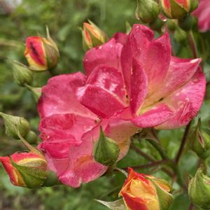 1日中、細かな雨☔が降っています🙂 我が家の薔薇🌹開花第一号は 💚レイニーブルー💜でした✨ 水滴💧をたくさん纏って咲いていました🙂↕️ 2、3枚目は蕾ですが、色がわかるぐらいに蕾があがった時、赤❤️が見えて😳驚きました(ラベル間違いかと思って…) そんな時、GSの投稿でレイニーブルーの蕾は赤いと知り、安心😌