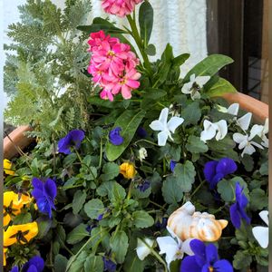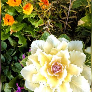 おはようございます🤩 寄せ植え 葉牡丹 カレンデュラ(キンセンカ) パンジーetc. 色白の美人さんをパシャリ😍カワイ🤍💓