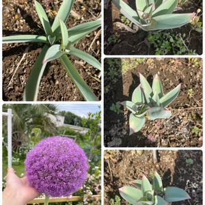 アリウムギガンチウム 昨年植えて植えっぱなしで4つまた出てきました𖥧𖧧 ˒˒.🟣🟣🟣🟣 一昨年は全滅でした😆 ↙️花は昨年のpic 丸くて可愛たまにカエルが🐸隠れる事も☺️