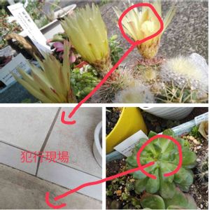 今朝、出勤前に日が少しでも当たるところに移動した時に 見つけました。 昨日は雨だったので☔の当たらない車庫の奥、 玄関ドア近くに置いてたんです。 暗くなって帰宅したので確認してなくて でも犯人は別々か? サボテンは花片に丸い穴のみ。 ブルーエルフは真ん中の成長点を中心に・・・ こちらは緑のお団子状の痕跡を残してました。 犯人は飛んでいったか鉢の土に潜ったか見つからず・・・ ☔をよけて良かれと思ったのにここでの被害は初です。 さてどうしようか・・・ 取りあえず今日は帰ったらチェックします。