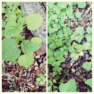 気まぐれで随分前に食用ほおずきの実を3粒ほど埋めてました。 最近わさーっと芽が出てきたので 場所といい、きっとほおずきだと思うのですが 葉の形が二種類います。 左の丸い葉の方が正解と思って大きめの子を残してます。 合ってるのかな? ギザギザの方も残してみようか・・・