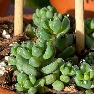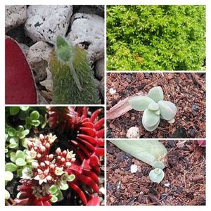 家の多肉さん達です。 と言ってもちゃんと根付いているのは 右上のグリーンの団体さんだけです。 後は葉刺しのベビちゃんとご近所さんが 伸びた蕾をお裾分けで✂️してくれたものです。 お花可愛いです。